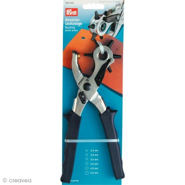 La pince à percer Prym vous servira à faire des trous très facilement dans le cuir, le simili et toutes autres matières similaires. Cette pince possède plusieurs diamètres de perçage, à savoir2,5 mm, 3 mm, 3,5 mm, 4 mm, 4,5 mm et 5 mm.