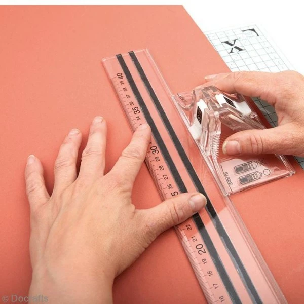 Cette règle de découpe graduée, vendue ici avec 3 lames en acier, mesure 40 cm. Elle permet de réaliser des coupes droites et précises en toute facilité. En effet, vous n’avez qu’à faire glisser la lame sur la règle pour effectuer des découpes nettes sur de nombreux supports (jusqu’à 7 mm d’épaisseur)papier, carton, feutrine, mousse, etc.