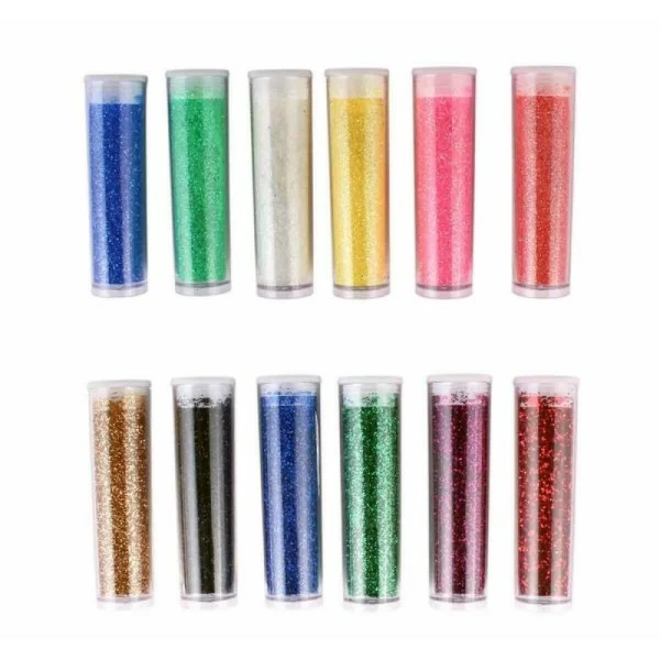 Des tubes contenant 12 poudres à paillette de couleurs différentes à mettre partout pour les fêtes ou pour la décoration.